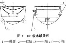 鐵水罐是冶金行業(yè)使用非常廣泛的一種設(shè)備,它的作用是裝運(yùn)煉鐵廠生產(chǎn)出來的鐵水,并通過鐵水罐車將其運(yùn)送到鑄鐵車間鑄鐵或煉鋼廠煉鋼。煉鐵廠100 t鐵水罐型號為ZT -100 - 1型,其結(jié)構(gòu)的特點(diǎn)是罐臂(包括圖1所示2, 3部分)采用鑄造,罐身采用焊接,罐臂與罐身互焊。